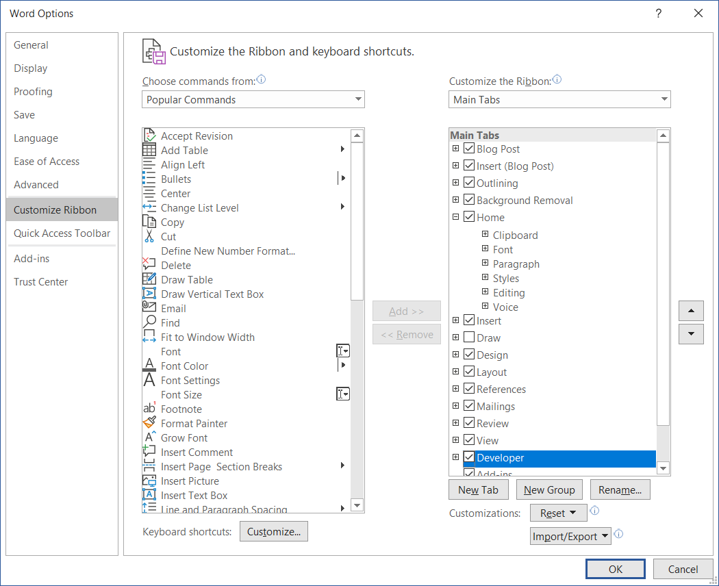The first step is to display the Developer Tab in Word. This can be done by clicking on File and then on Options in the lower left corner. In the Options dialog you select Customize Ribbon and then select Developer as shown below.